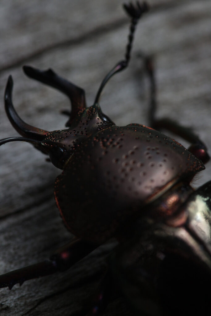 Es una hembra de Madre Culebra (Acanthinodera cummingii), el coleóptero más grande de Chile. Después de casi seis años alimentándose y viviendo en estado de larva en el interior del tronco de viejos robles, ahora se ha transformado en este increíble coloso de grandes mandíbulas.